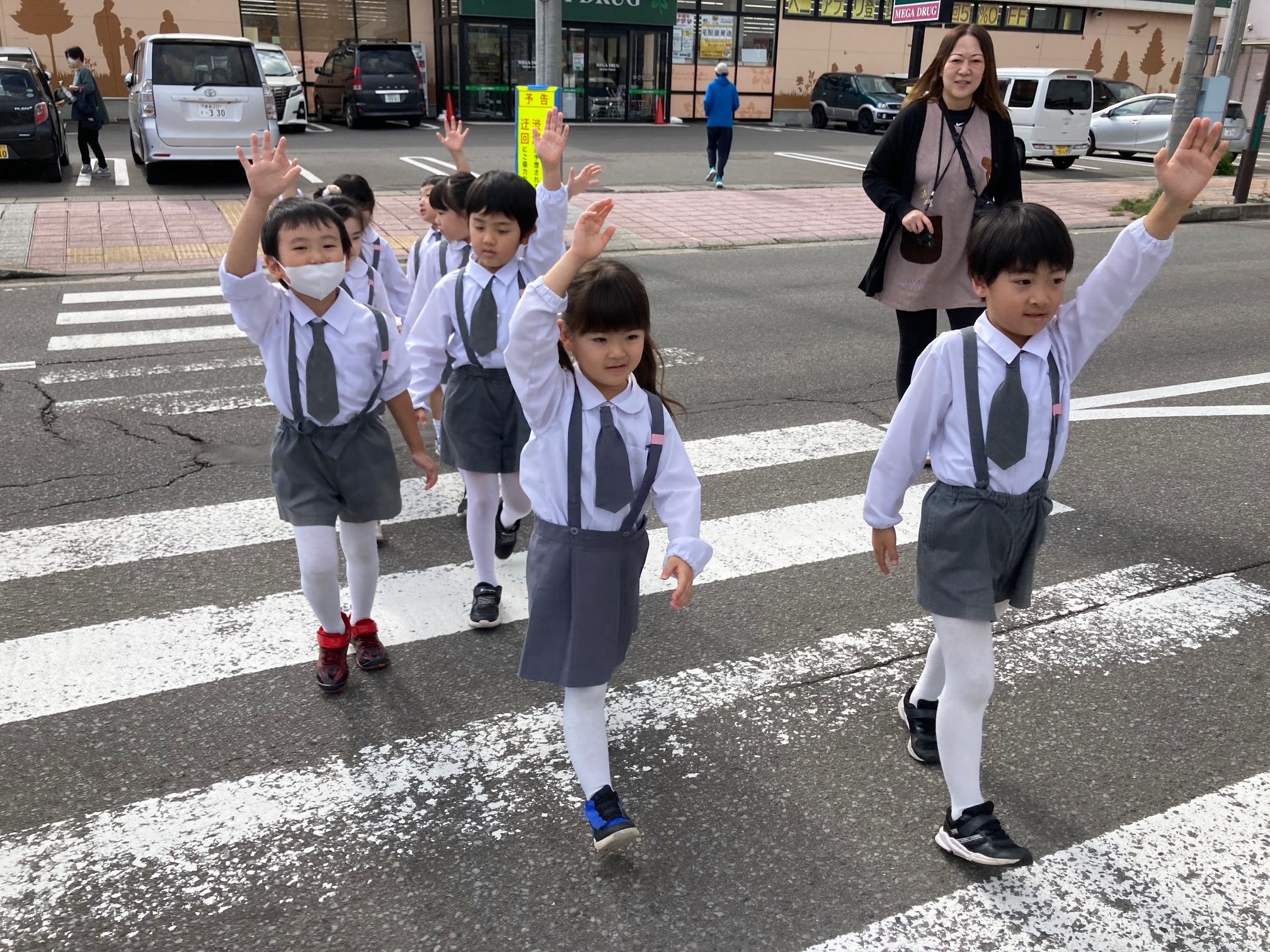 横断歩道はしっかり手を上げて渡ります♪