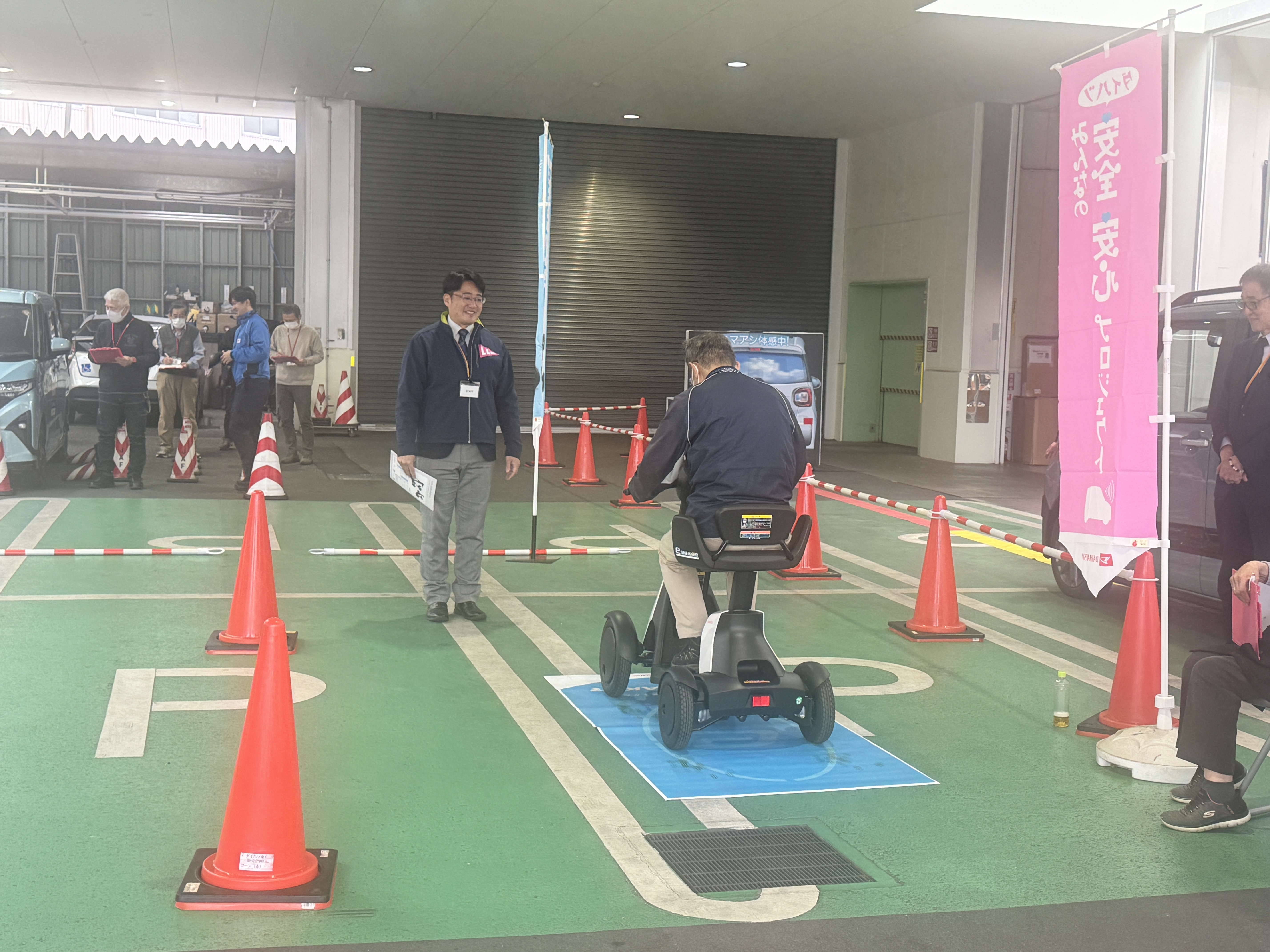 屋外では、JAF東京都支部様による運転姿勢と死角の確認、ダイハツ東京による衝突回避支援システム(スマアシ)の体験、さらにe-SNEAKERの試乗体験を行いました。