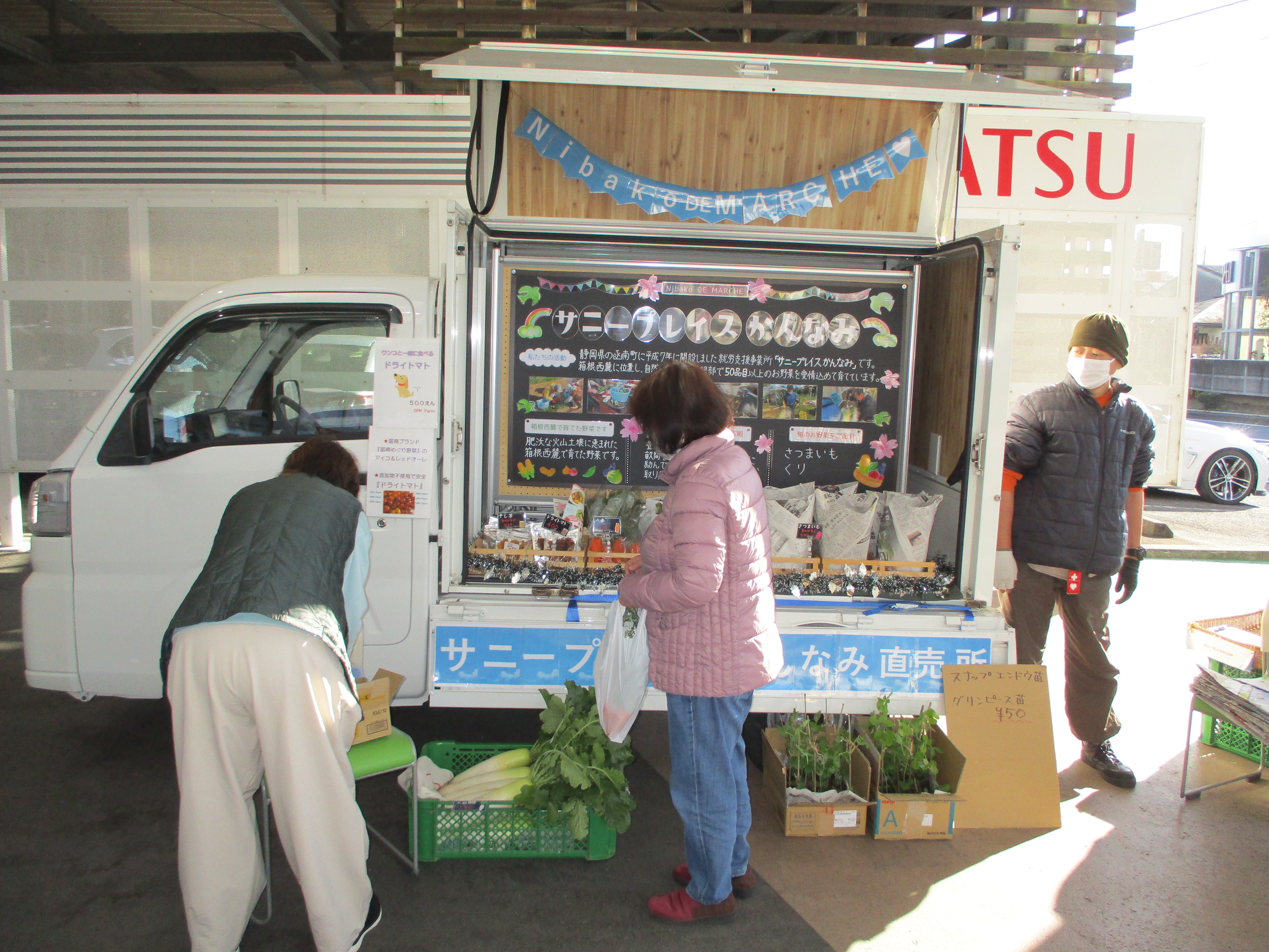 『サニープレイスかんなみ』さんにも「Nibako」を使って人気のドライベジや新鮮野菜の販売、『ときどきファーム』さんも旬のお野菜販売、『函南町わかくさ共同作業所』さんは焼き菓しと手芸用品、『合同会社 のぞみ』さんはかわいいヘアアクセサリーが並び、プチマルシェを盛り上げてくださいました。
