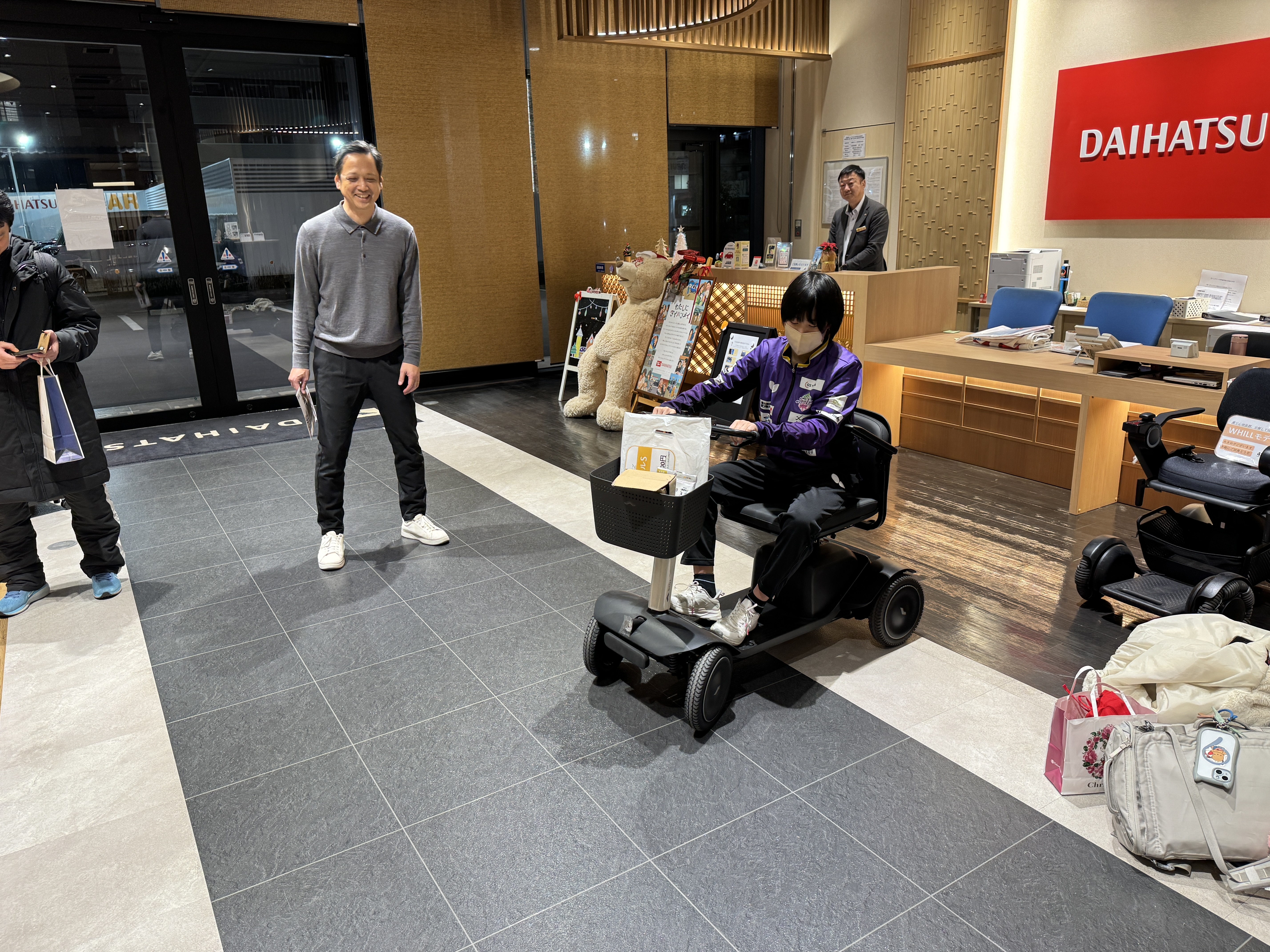帰宅の準備が整った松島選手と白藤選手が、ショールームに展示してあるe-SNEAKERとWHILLに興味を示され、ご試乗いただくことになりました😊