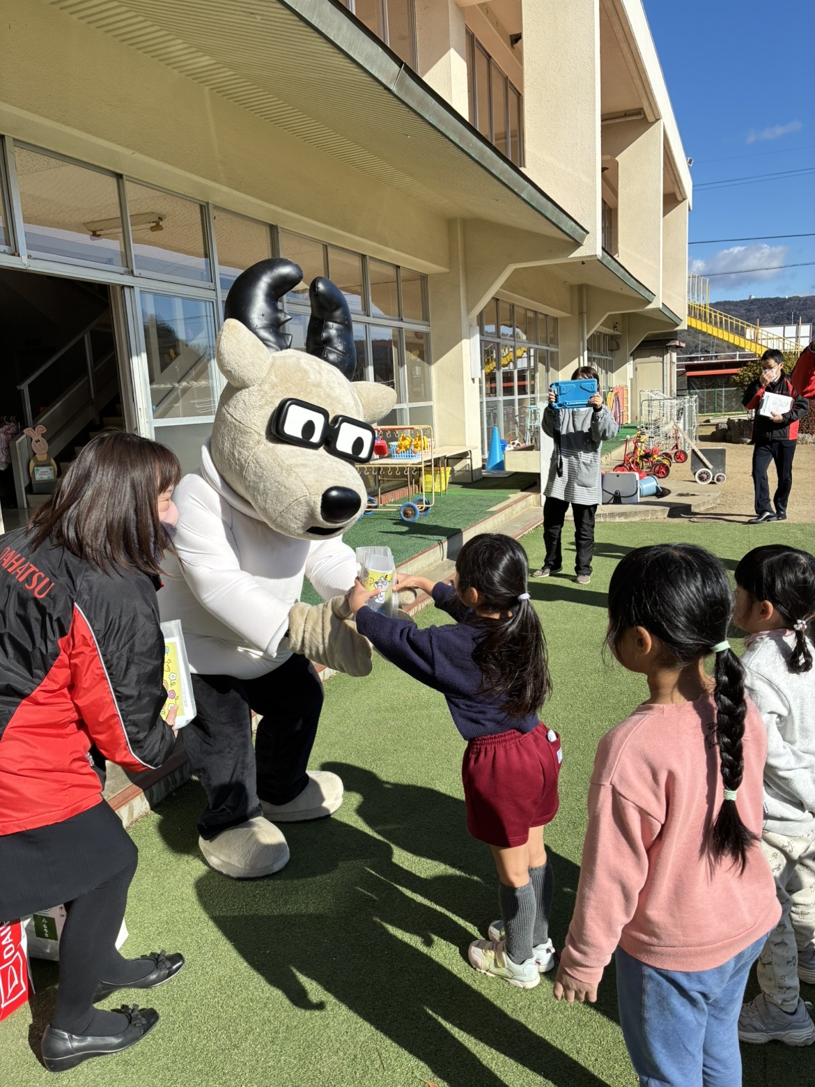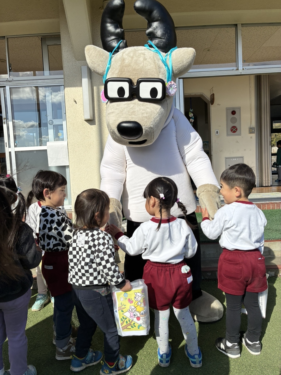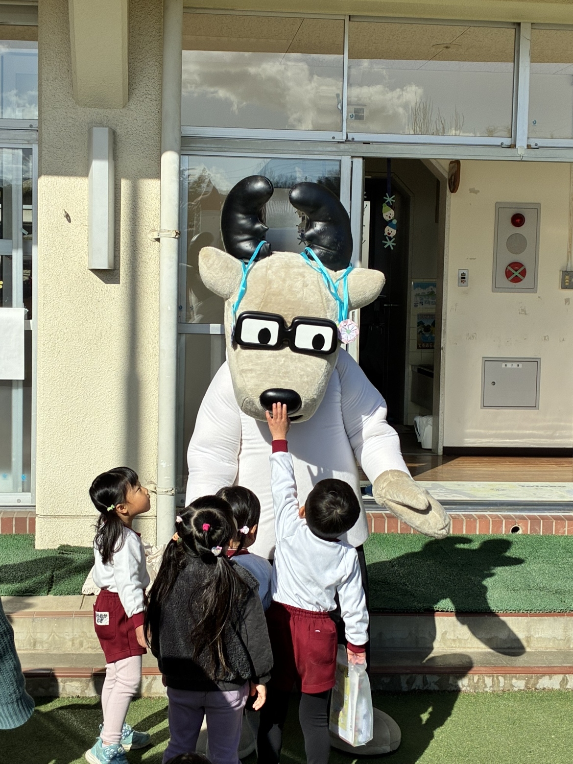 何日も前から「カクシカ君がやってくるよ」と先生たちがわくわくムードを作ってくれたおかげで、カクシカ君の登場にお遊戯室は大盛り上がり。