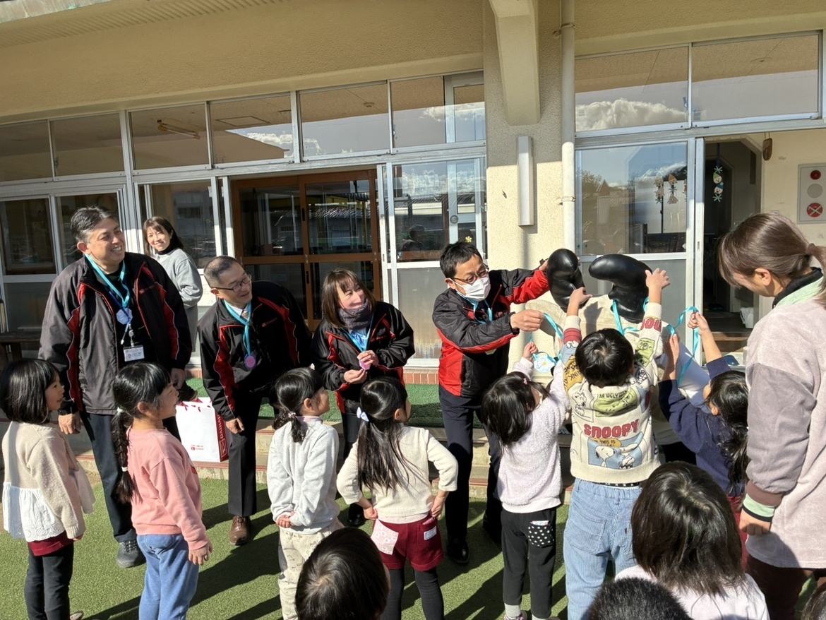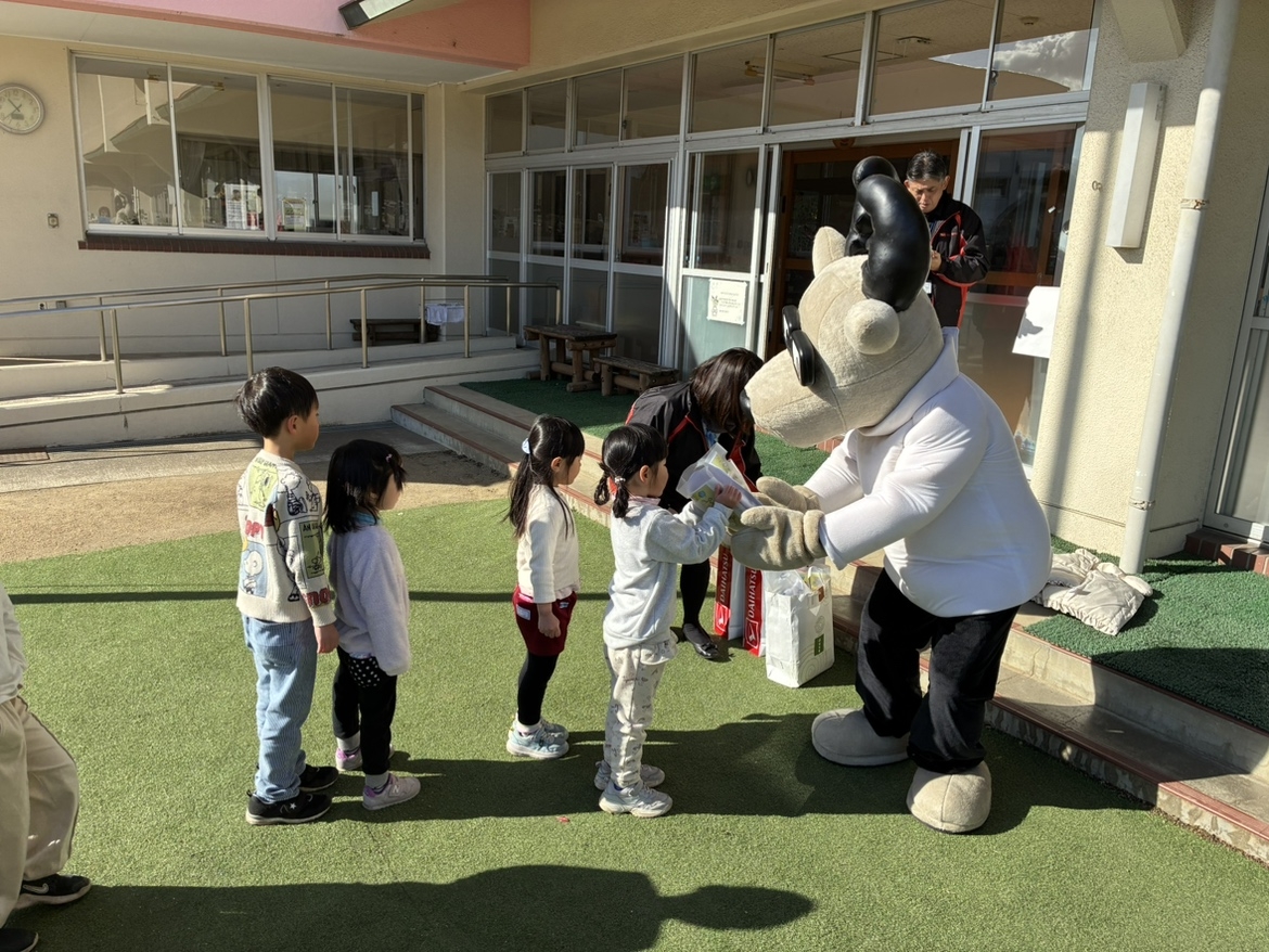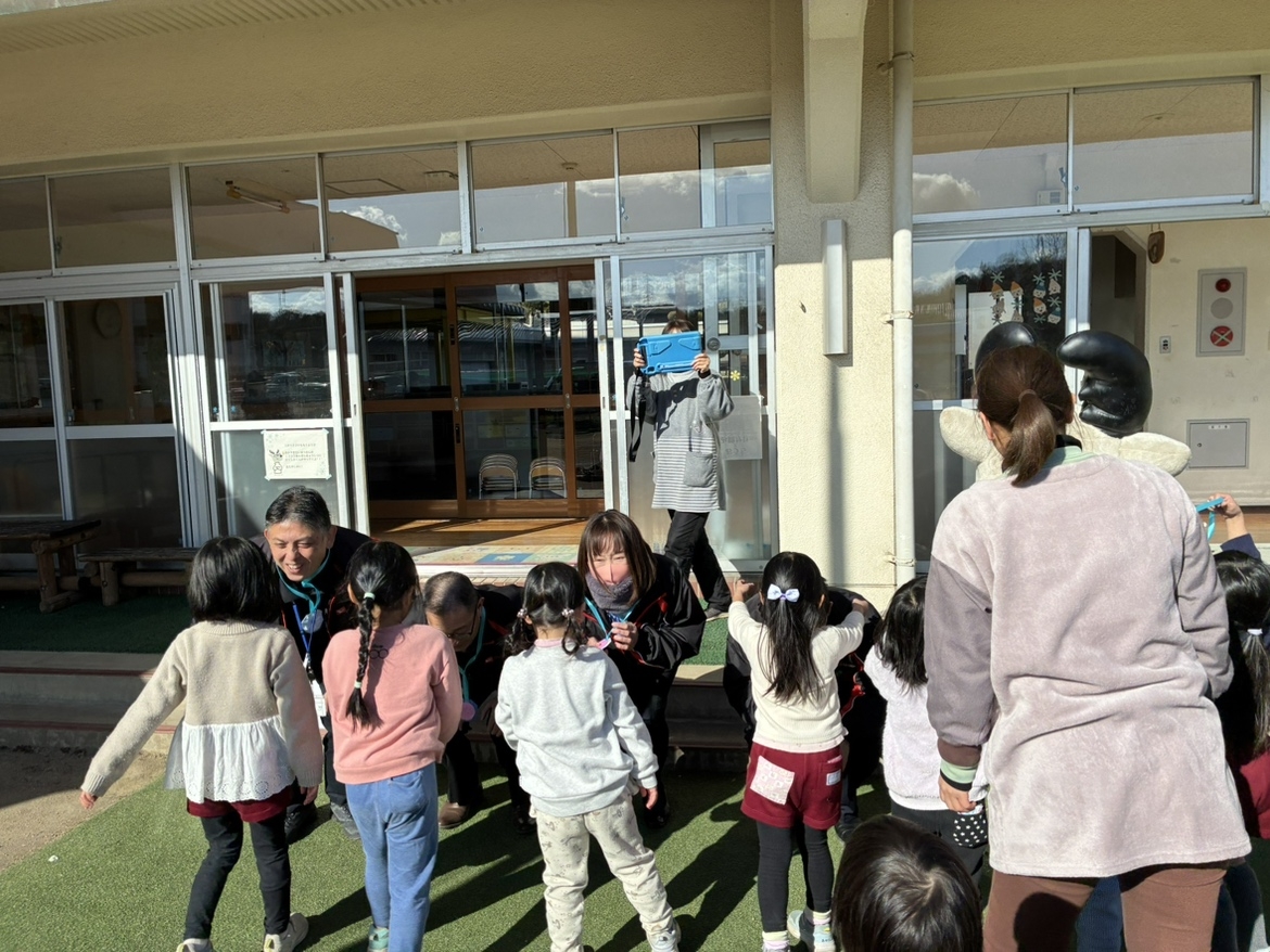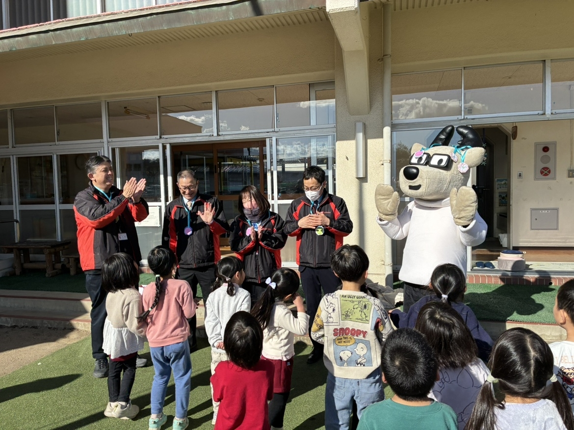 何日も前から「カクシカ君がやってくるよ」と先生たちがわくわくムードを作ってくれたおかげで、カクシカ君の登場にお遊戯室は大盛り上がり。