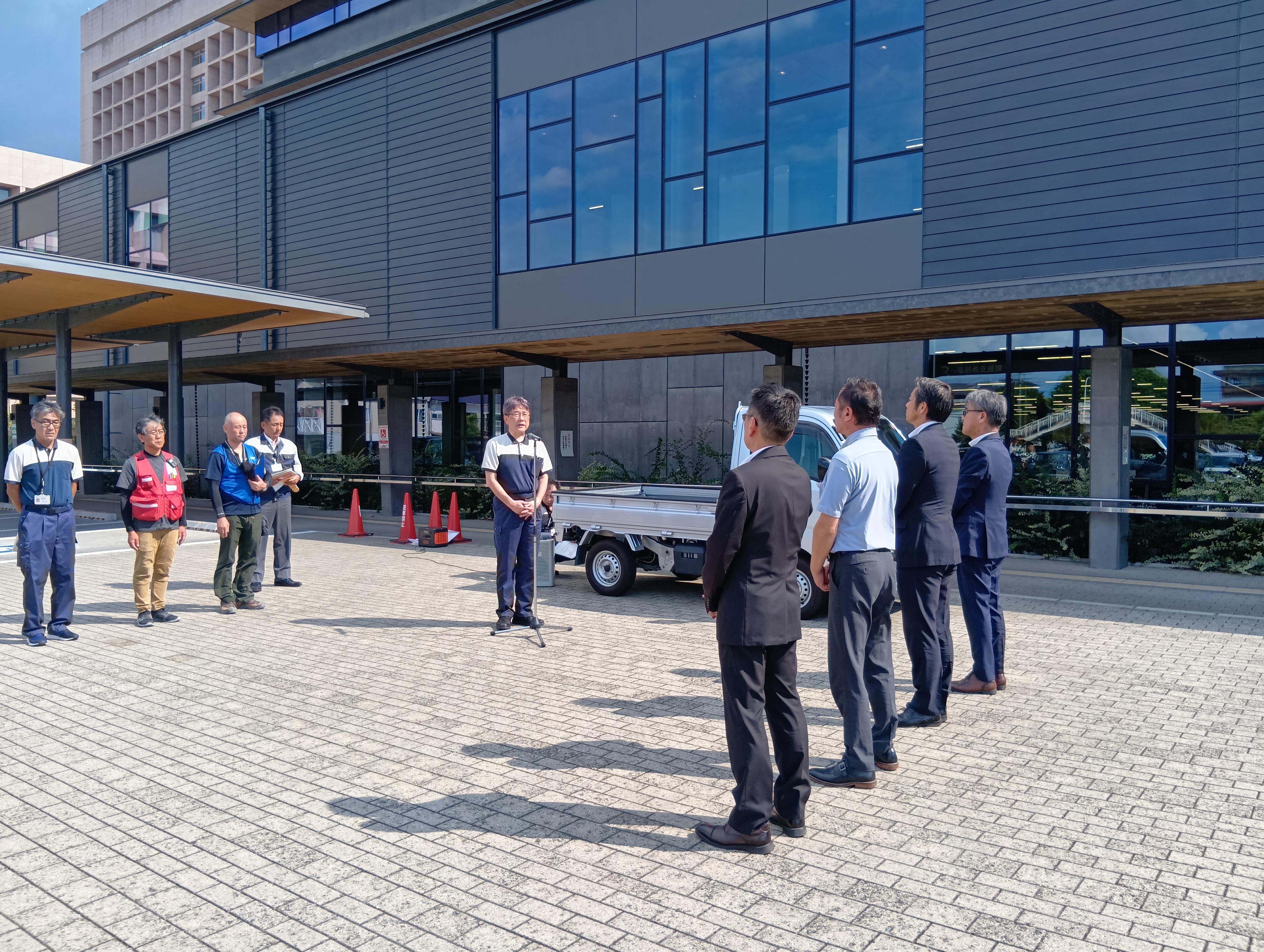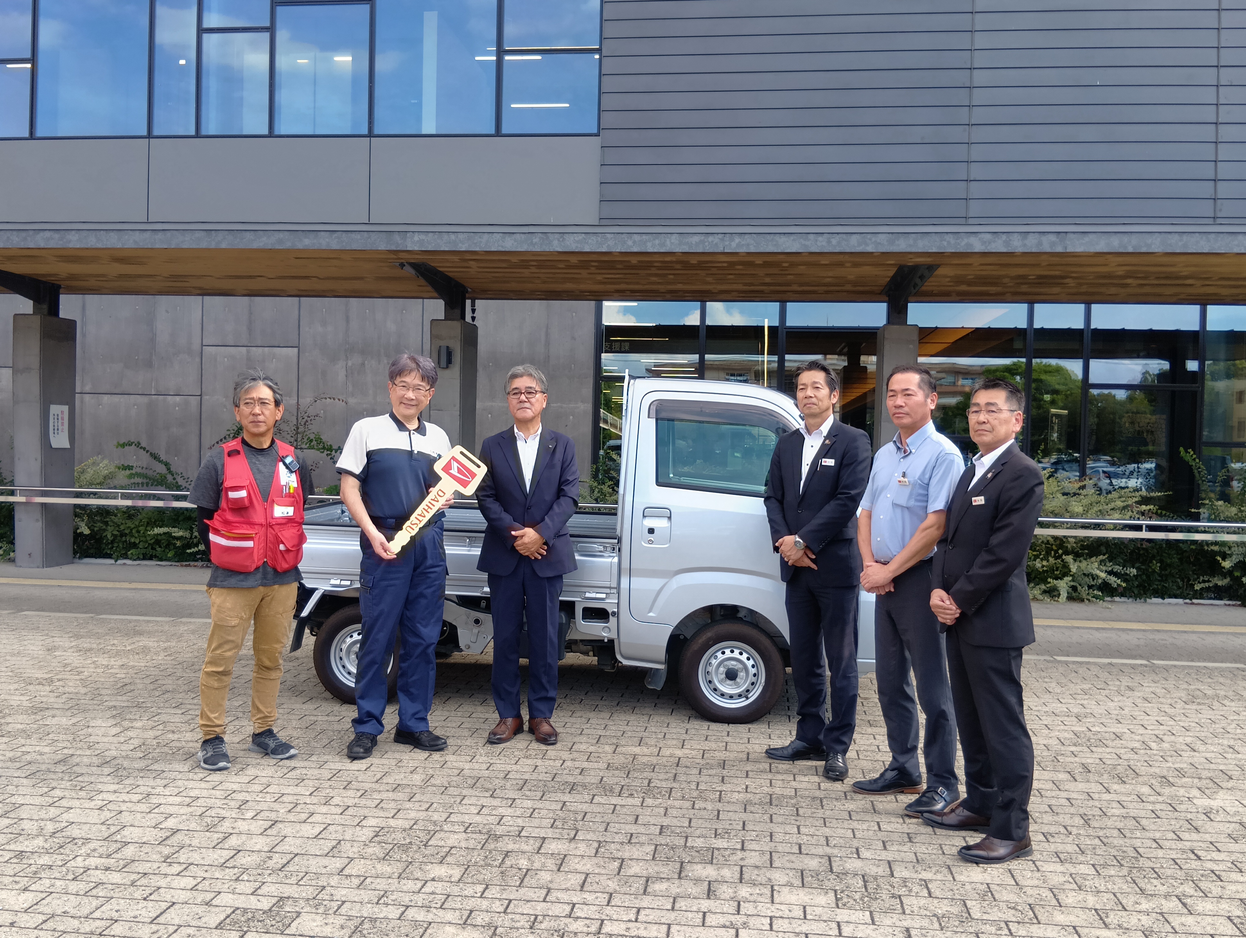 2025年8月の豪雨災害により被害が大きかった八代市へ、ボランティアの方々が被災した住居の片付けや、がれき・土砂などの撤去作業にご利用いただき、一日も早い復旧作業にお役立ていただきたく、軽トラック(ハイゼットトラック)1台無償にて貸与させていただき、9月3日八代市役所にて車両の引渡し式が行われました。