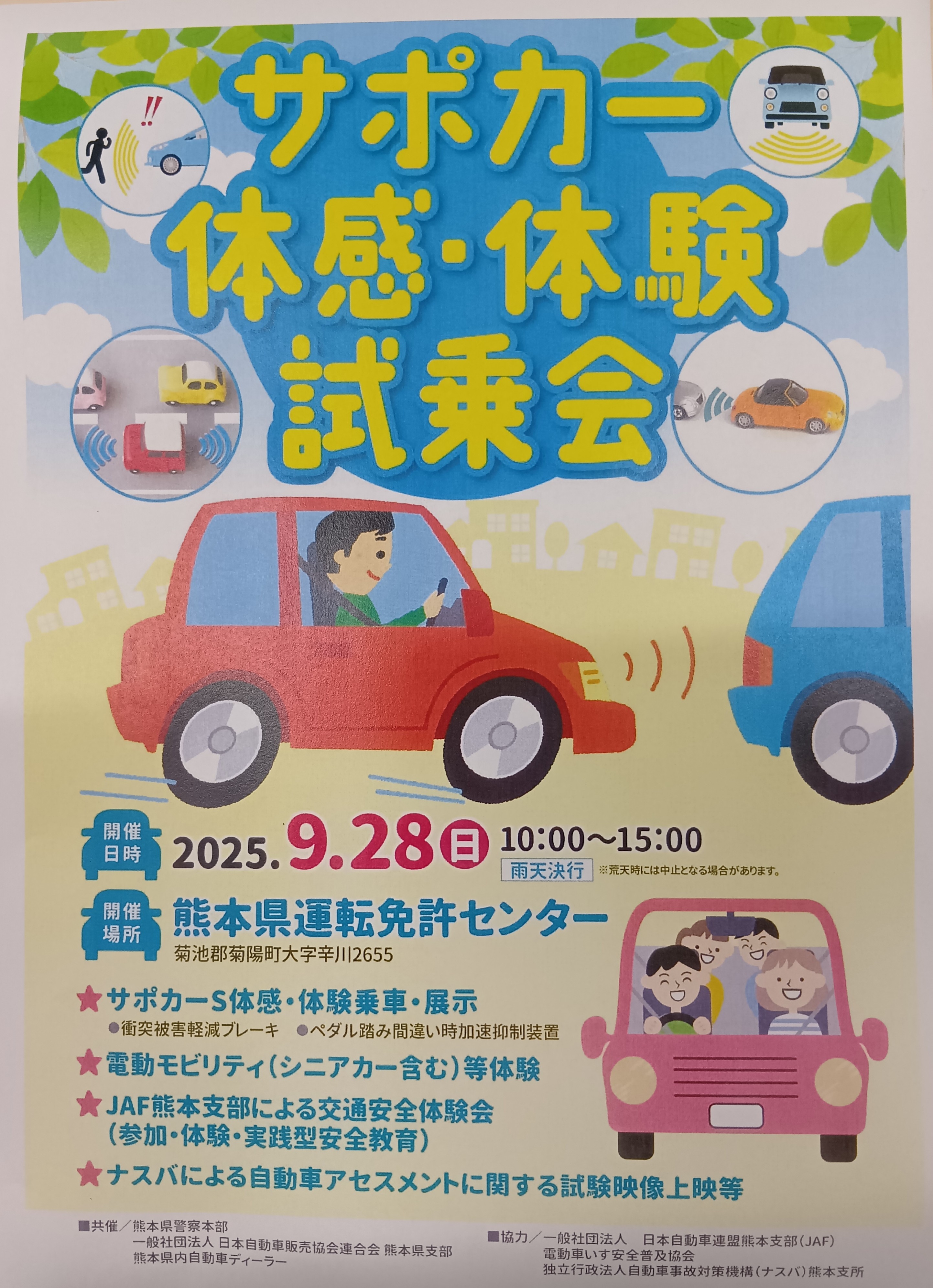 2025年9月28日(日)熊本県運転免許センターにて熊本県警察本部・日本自動車販売協会連合会熊本県支部・熊本県内自動車ディーラー共催、日本自動車連盟熊本支部(JAF)・電動車いす安全普及協会・自動車事故対策機構(ナスバ)熊本支所の協力により、全国交通安全運動の一環として開催されました。会場では県内ディーラーによるサポカーS体感・体験乗車、電動モビリティ(シニアカー含む)等の体験、福祉車両車展示、JAF熊本支部による交通安全体験会、ナスバによる自動車アセスメントに関する試験映像上映、パトカー展示等が行われ免許更新に来られた方や近隣の方々が体験されました。